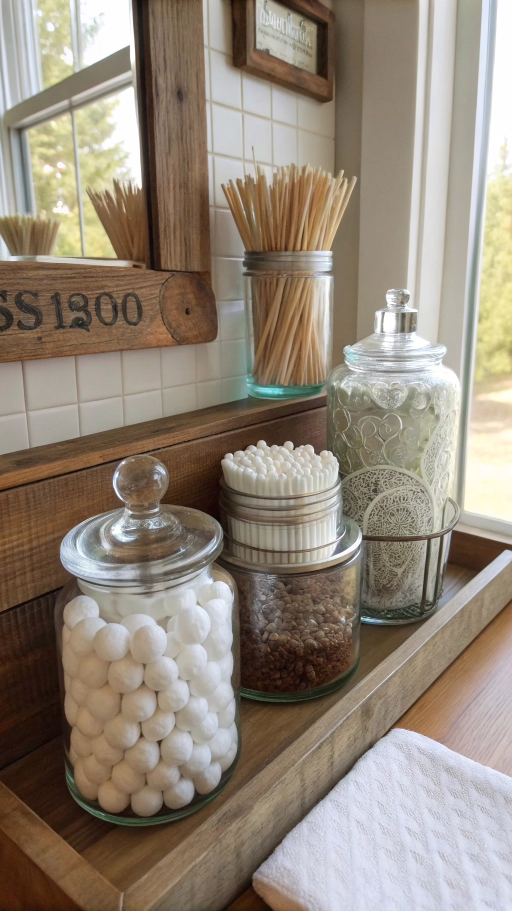 Display your toiletries in a stylish way to maintain the farmhouse aesthetic. Use glass jars or vintage containers to store cotton balls, swabs, and other essentials. This not only keeps your bathroom organized but also adds a decorative touch that complements the overall design.