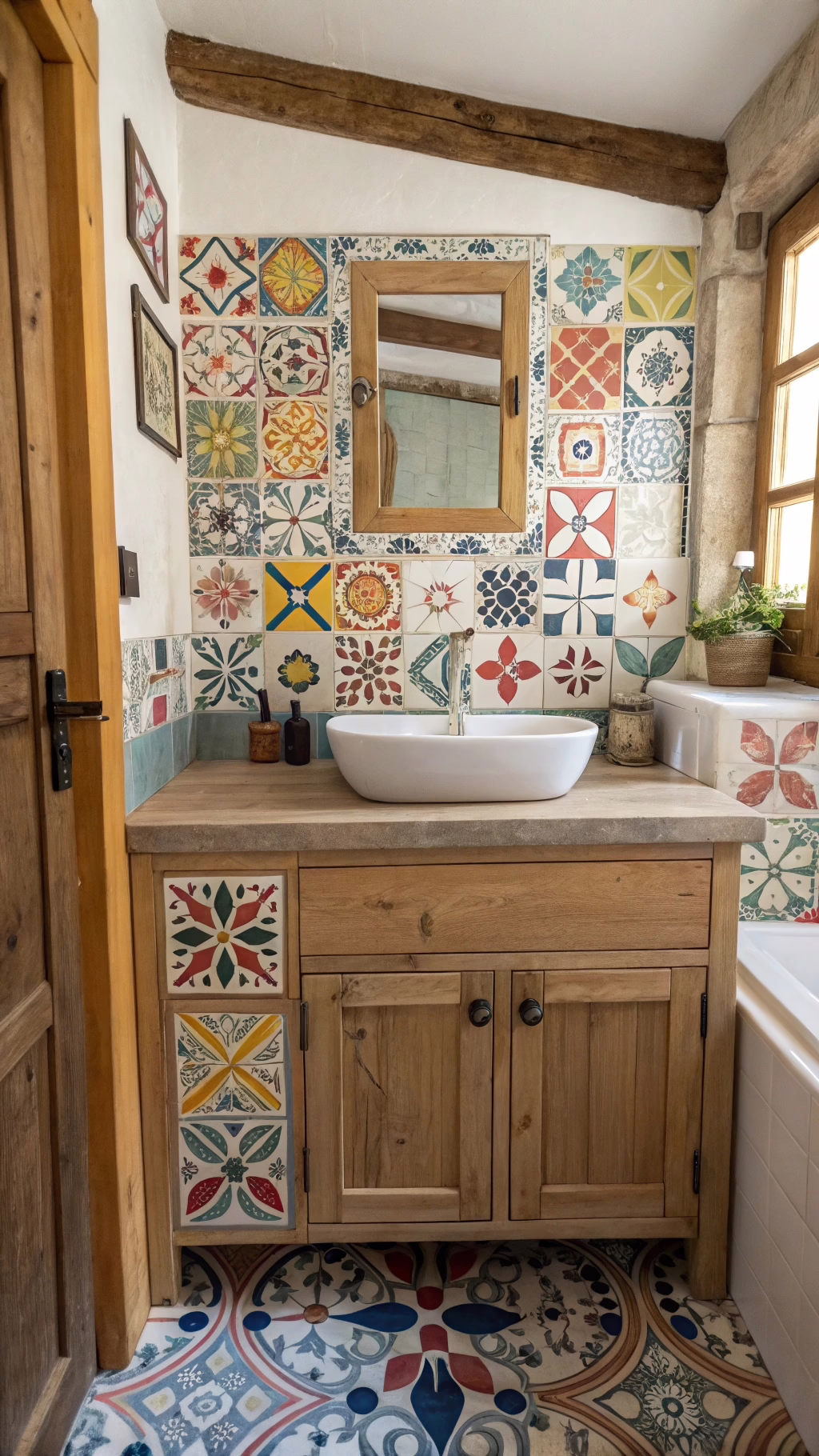 Incorporating colorful tiles can add a playful touch to your farmhouse bathroom. Consider using patterned tiles for the floor or as a backsplash behind the sink. These tiles can create visual interest and serve as a focal point, enhancing the overall design.