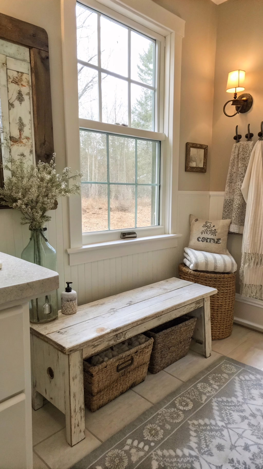 Incorporating cozy seating into your farmhouse bathroom can create a relaxing atmosphere. A small bench or a vintage chair can provide a place to sit while getting ready or enjoying a moment of tranquility. Choose pieces that complement the overall design, such as a distressed wood bench or a cushioned chair in soft fabric.
