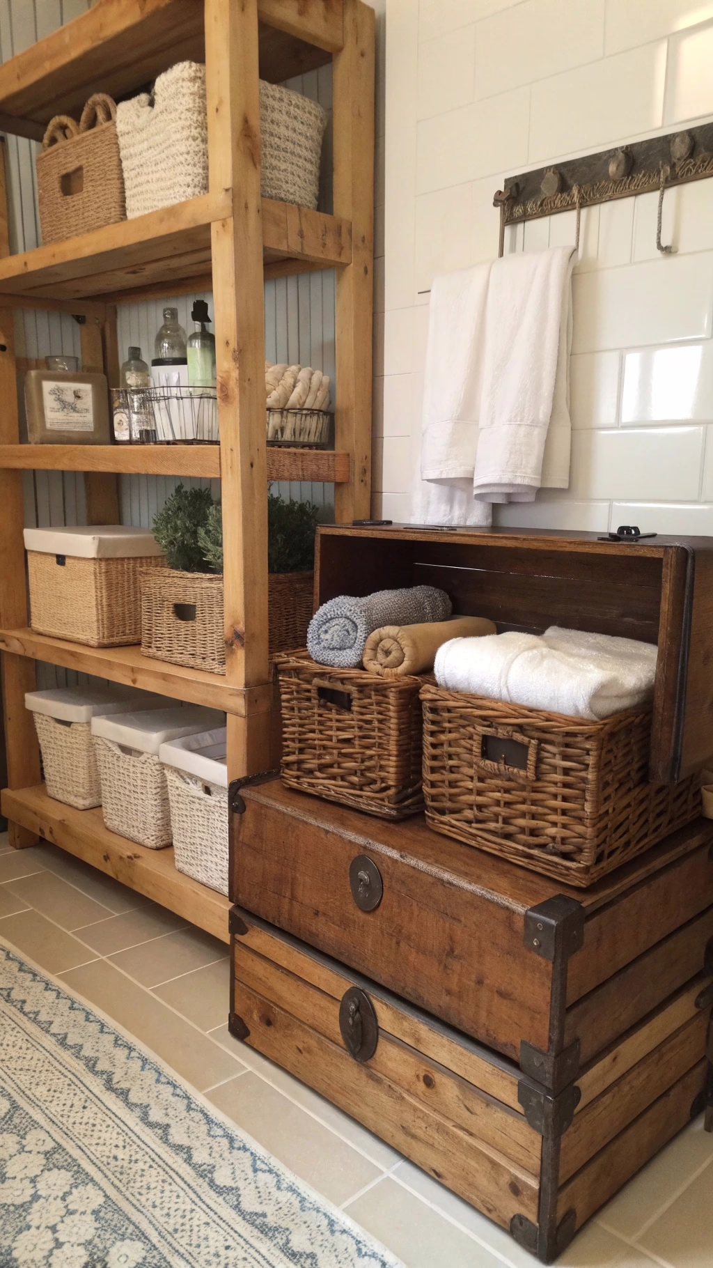 Incorporating rustic storage solutions can help keep your farmhouse bathroom organized while maintaining the aesthetic. Use wooden crates, wicker baskets, or vintage trunks to store towels and toiletries. These storage options can add character and charm while ensuring everything has its place.