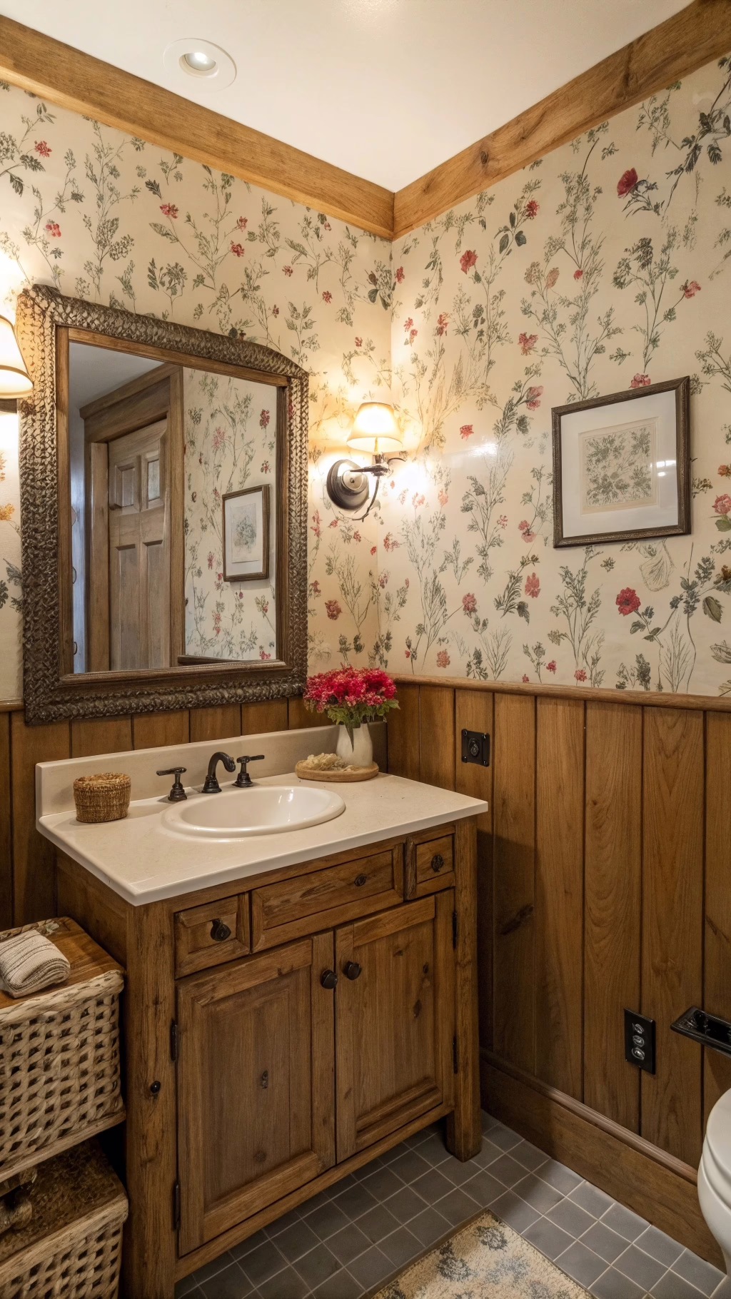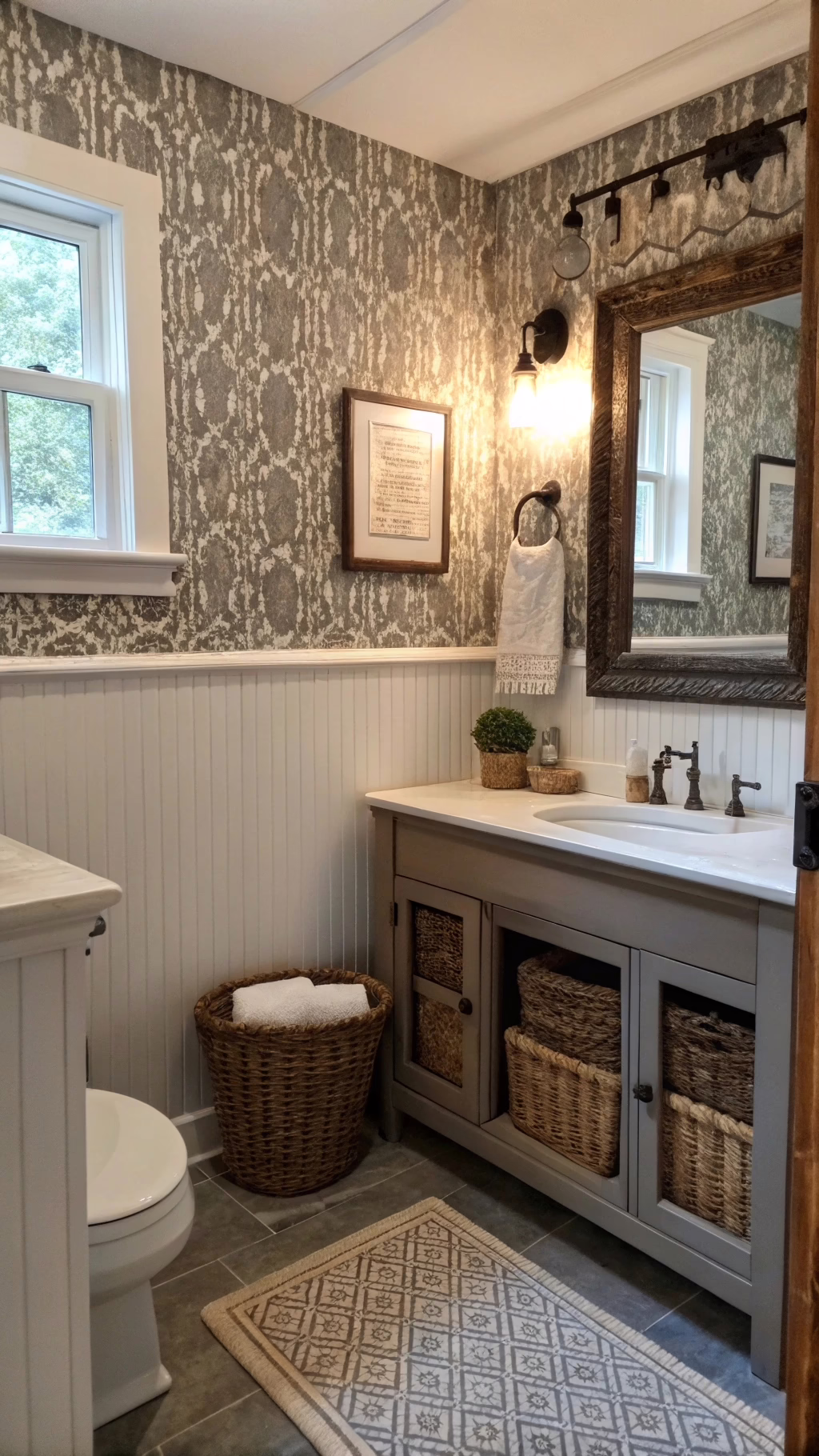 Using farmhouse-style wallpaper can add a unique touch to your bathroom. Look for patterns that feature florals, stripes, or rustic motifs. Wallpaper can create an accent wall or be used throughout the space to enhance the overall design, providing a cozy and inviting atmosphere.