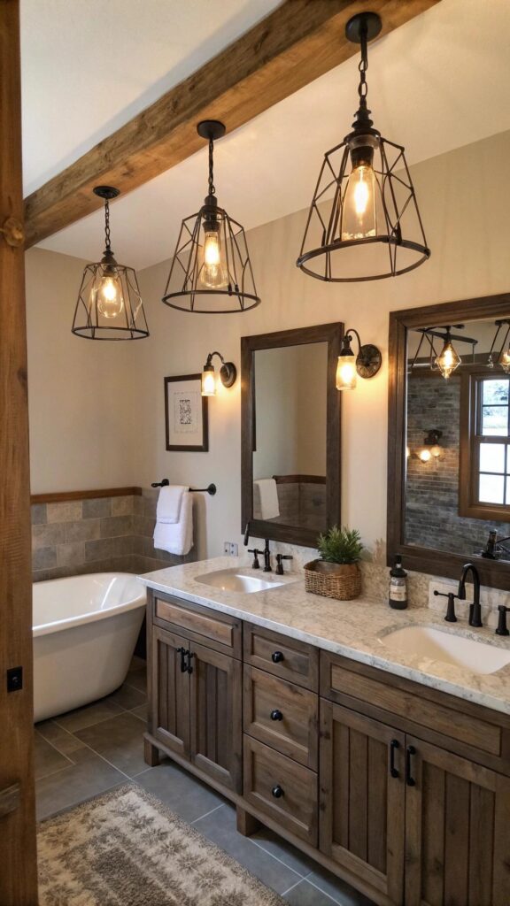 Lighting plays a crucial role in setting the mood of your bathroom. Farmhouse-style lighting fixtures, such as pendant lights or wrought iron sconces, can add a touch of elegance.