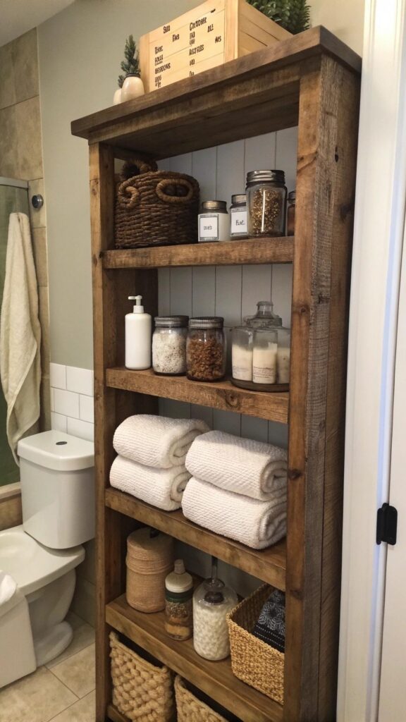 Open shelving is a practical and stylish way to display your bathroom essentials. Use reclaimed wood shelves to maintain the farmhouse aesthetic, and arrange items like towels, jars, and decorative pieces for a curated look.