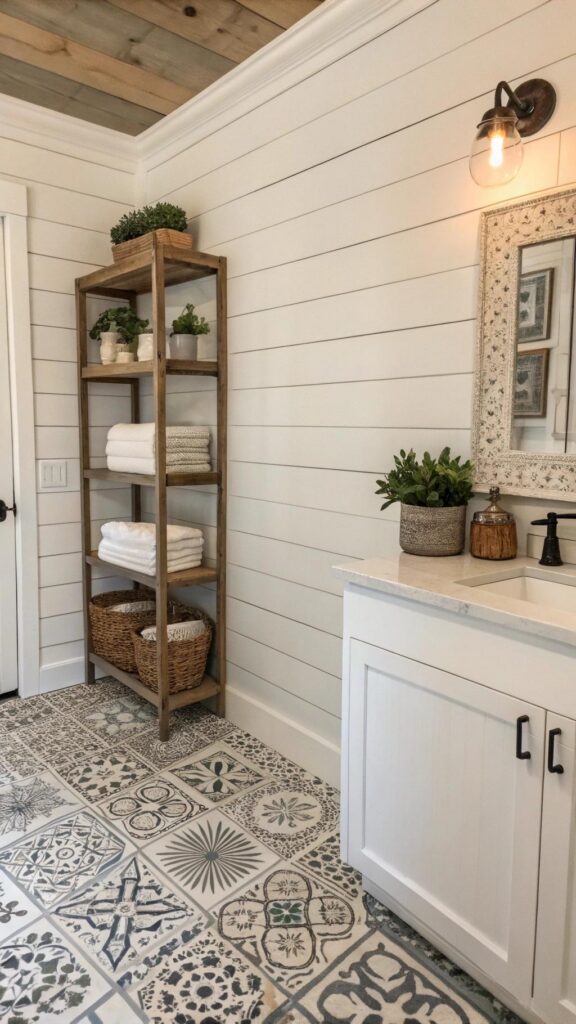 Shiplap walls are a hallmark of farmhouse design, adding texture and character to any bathroom. The horizontal planks can be painted in soft whites or muted pastels to create a serene atmosphere.