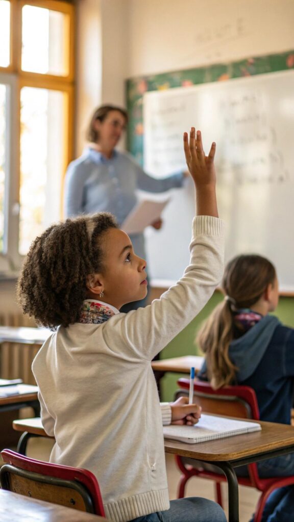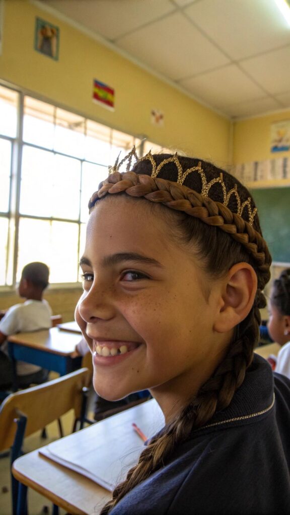 A half-up crown braid is a romantic and elegant hairstyle for the first day of school. It’s perfect for adding a touch of sophistication to your look. This style works well for medium to long hair.