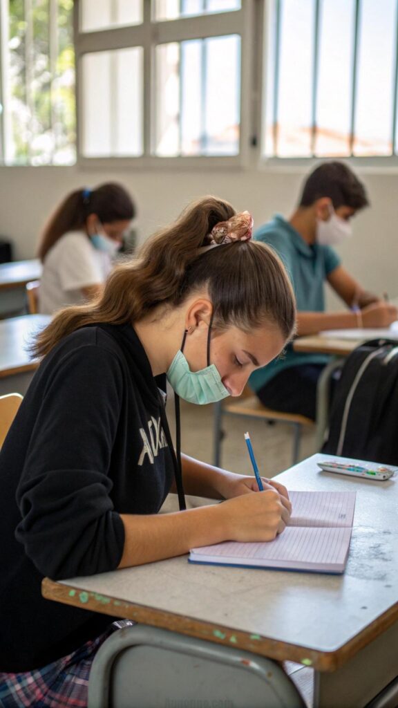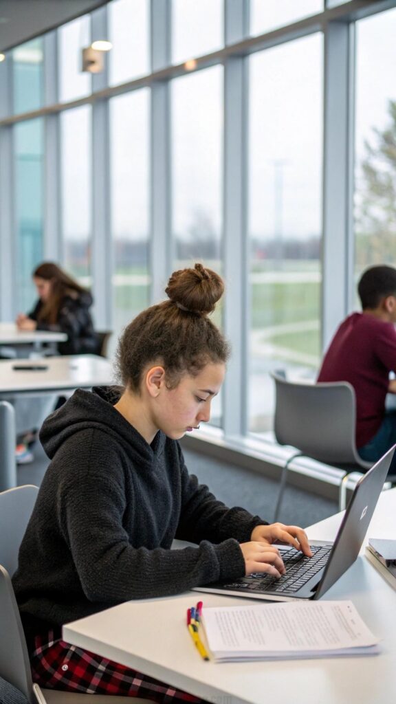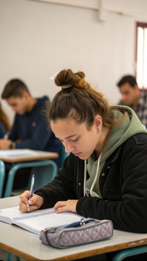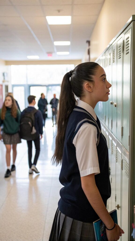 A low ponytail with a scrunchie is a retro and trendy hairstyle for the first day of school. It’s perfect for a casual yet stylish look. This style works well for all hair lengths.