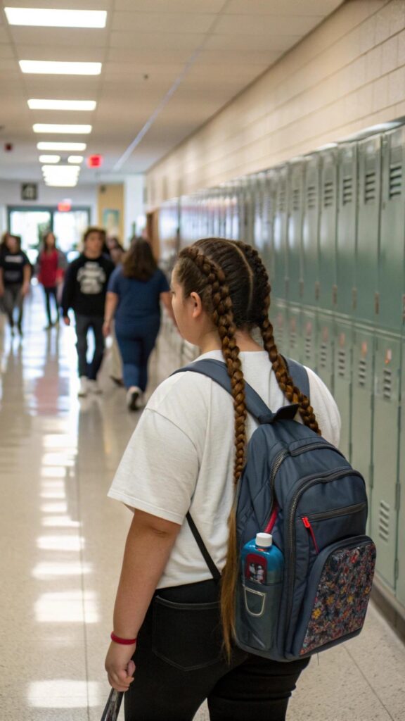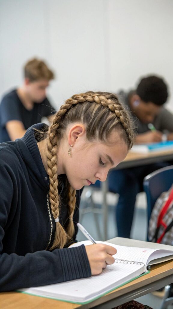 Double braids are a fun and practical hairstyle for the first day of school. They’re perfect for keeping your hair secure and looking great. This style works well for medium to long hair.