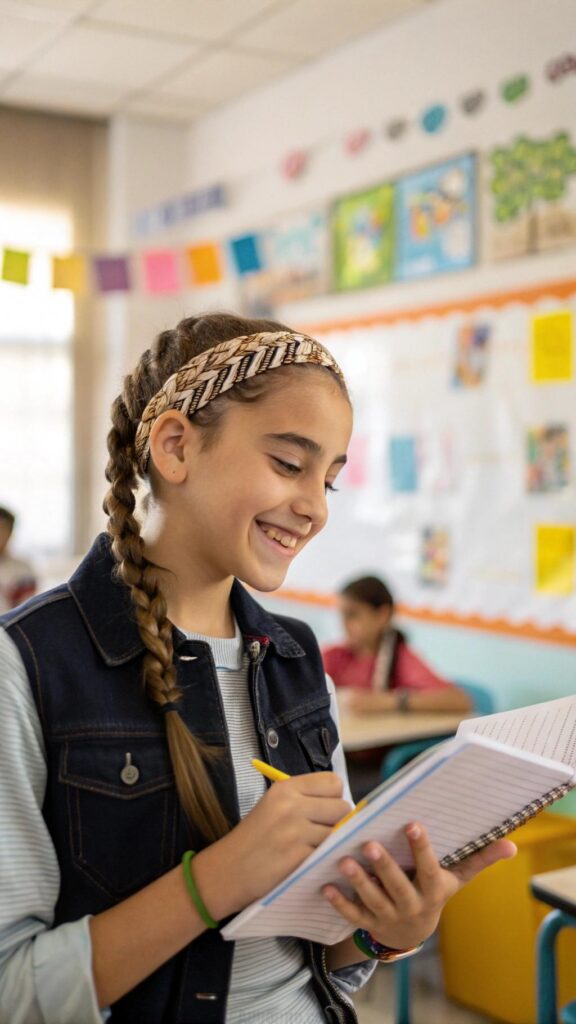 A twisted headband braid is a elegant and unique hairstyle for the first day of school. It’s perfect for adding a touch of sophistication to your look. This style works well for medium to long hair.