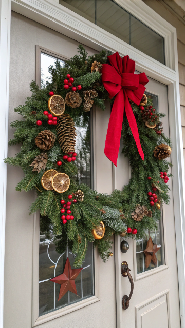 A classic Christmas wreath is a timeless decoration that can instantly elevate your front porch. Choose a traditional evergreen wreath adorned with red berries, pinecones, and a big red bow for a festive touch. Hang it on your front door to welcome guests with holiday cheer. You can also create a DIY wreath using materials like burlap, ornaments, or even dried citrus slices for a unique twist.
