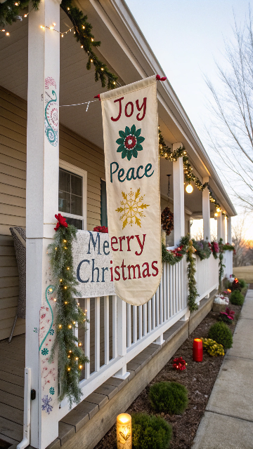 Add a festive touch to your front porch with holiday banners. Choose banners with cheerful messages like “Joy,” “Peace,” or “Merry Christmas,” and hang them across your porch or on the railing. You can find pre-made banners or create your own using fabric, paint, or paper.