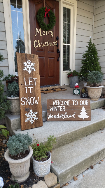 Add a personal touch to your front porch with holiday-themed signs. Create or purchase wooden signs with festive messages like “Merry Christmas,” “Let It Snow,” or “Welcome to Our Winter Wonderland.” Place them near your front door or in your planters for a charming touch.