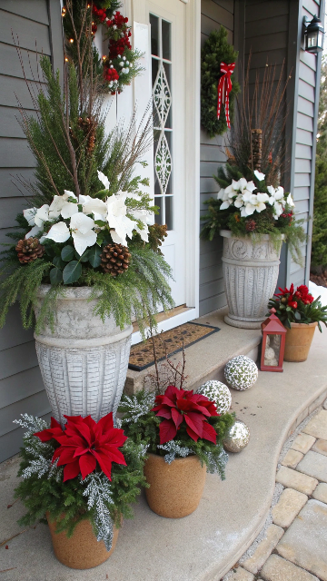 Add a touch of greenery to your front porch with festive planters. Fill large pots with evergreen branches, holly, and seasonal flowers like poinsettias for a vibrant display. You can also incorporate decorative elements like pinecones, ornaments, or ribbons to enhance the festive look. Consider using different heights and sizes of planters to create visual interest.