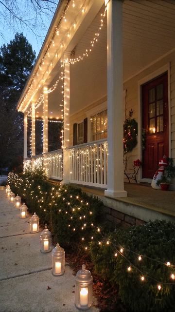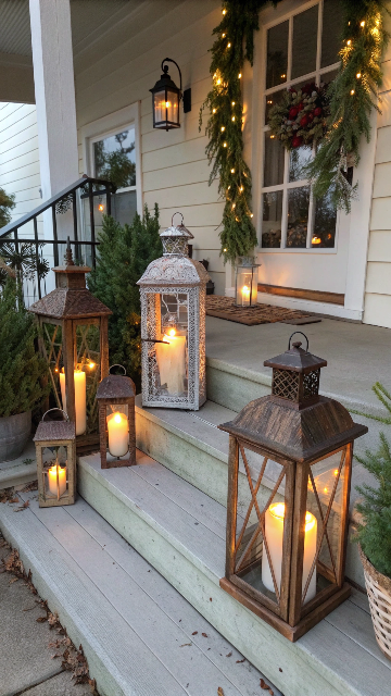 For a more festive look, consider using lanterns with holiday-themed designs or colors. You can also create a grouping of lanterns in varying heights for visual interest. This cozy lighting will enhance the holiday spirit and make your porch feel welcoming during the chilly evenings.