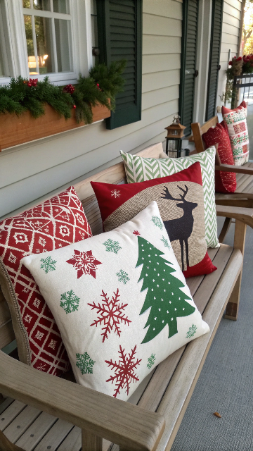 Add comfort and style to your front porch with holiday-themed pillows. Choose pillows with festive designs, such as snowflakes, reindeer, or Christmas trees, and mix and match different patterns and colors. This adds a cozy touch to your seating area and enhances the holiday spirit.