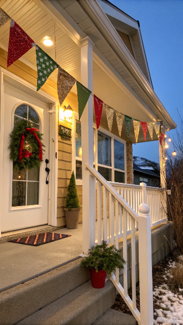 Bunting is a fun and festive way to decorate your front porch for Christmas. Choose fabric or paper bunting in holiday colors and patterns, and hang it along the railing, door, or ceiling. This adds a playful touch to your decor and creates a cheerful atmosphere.