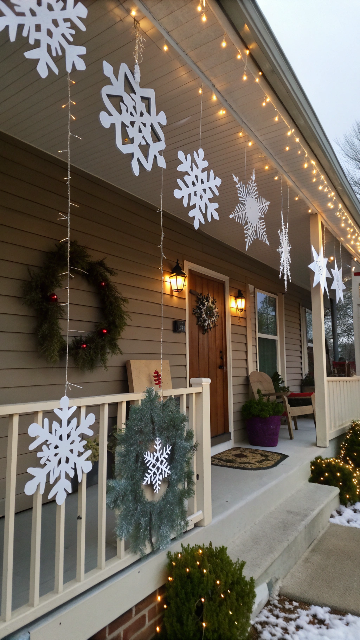 Create a winter wonderland on your front porch with DIY snowflakes. Use white paper, cardboard, or even wood to cut out snowflake shapes in various sizes. Hang them from the ceiling, attach them to your windows, or place them in your planters for a whimsical touch.