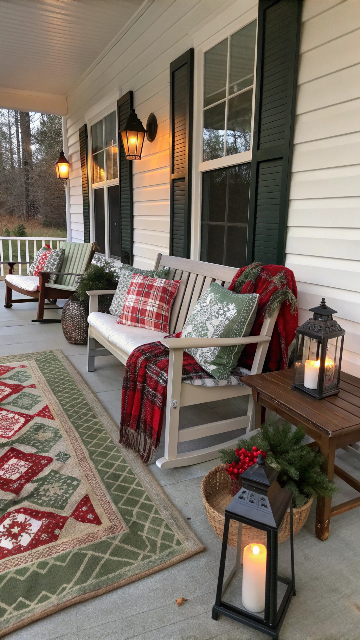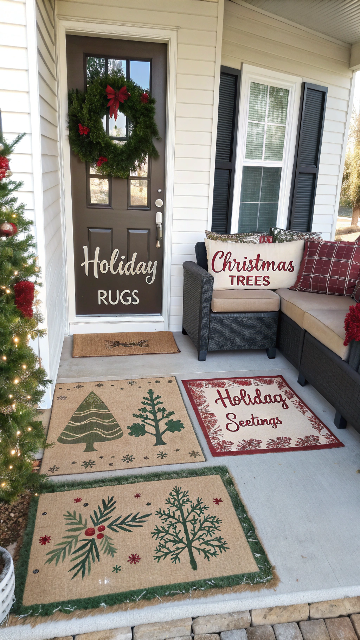 Enhance your front porch with holiday-themed rugs that add warmth and style. Choose rugs with festive designs, such as snowflakes, Christmas trees, or holiday greetings. A well-placed rug can define your seating area and create a cozy atmosphere.