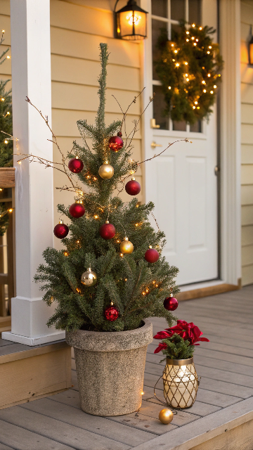 If you have space on your porch, consider adding a themed Christmas tree. Choose a small tree that complements your decor style, and decorate it with ornaments that match your color scheme. You can opt for a traditional look with red and gold ornaments or a more modern approach with metallics and whites.