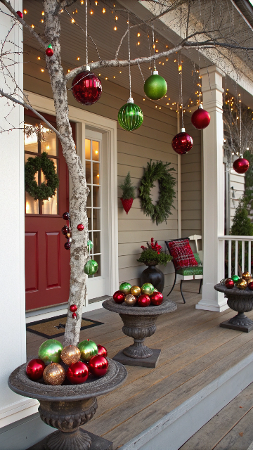 Incorporate Christmas ornaments into your front porch decor for a festive touch. Hang oversized ornaments from the ceiling or place them in decorative bowls on tables. You can also use ornaments to decorate your planters or garlands for added sparkle.