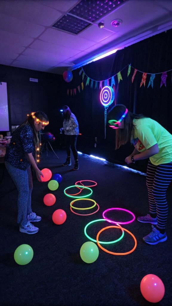 Set up glow-in-the-dark games like ring toss or bowling for added entertainment. This idea is perfect for an evening party and works well for both indoor and outdoor spaces. It’s a surefire way to make the celebration unforgettable.