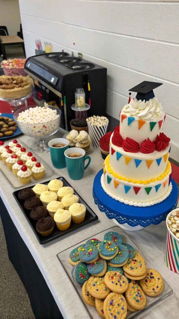 Serve light and refreshing snacks like fruit skewers, sandwiches, and iced drinks. This idea is perfect for a summer graduation and works well for all ages. It’s fun, casual, and easy to organize.