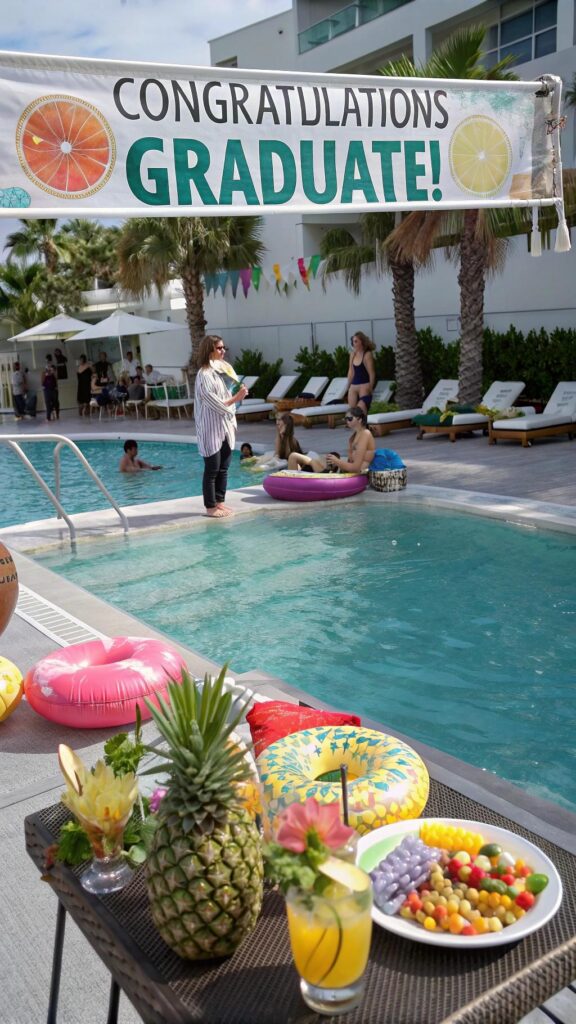 If the weather permits, a pool party is a refreshing way to celebrate graduation. Set up floats, pool games, and a shaded area for guests to relax. Provide sunscreen and towels to keep everyone comfortable.