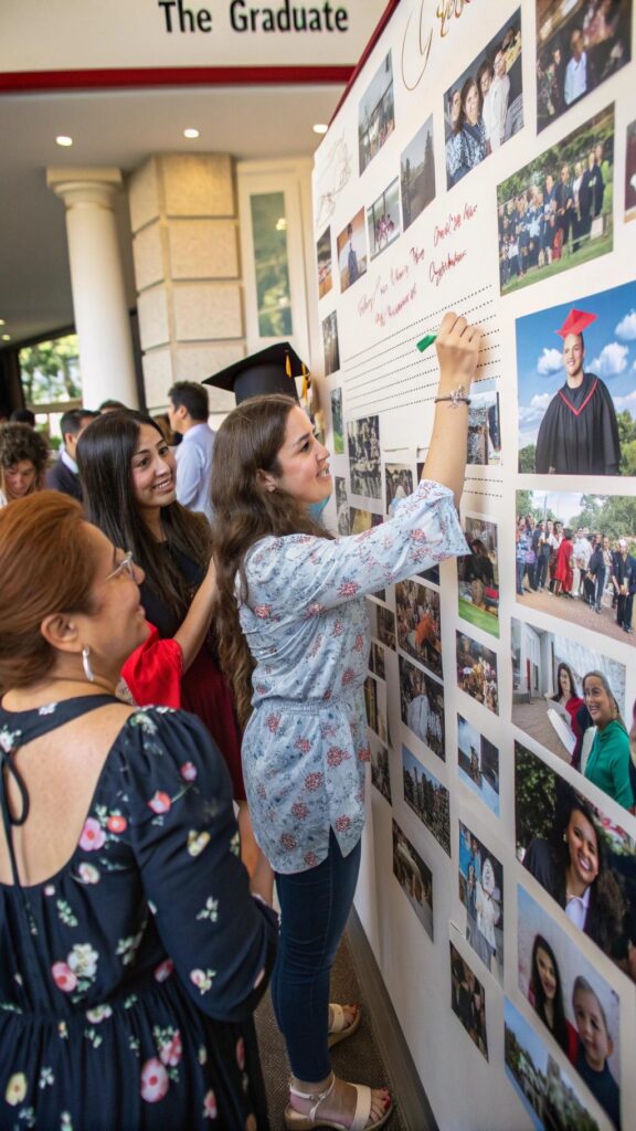 Set up a DIY photo collage wall where guests can add their favorite photos of the graduate. Provide pins, tape, and markers for decorating the wall.