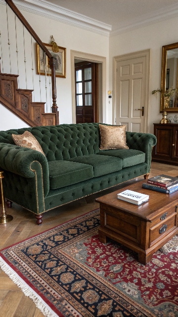 A dark green Chesterfield sofa brings timeless charm to a traditional living room. Pair it with rich wood tones, antique brass, and Persian rugs. The tufted design adds sophistication.