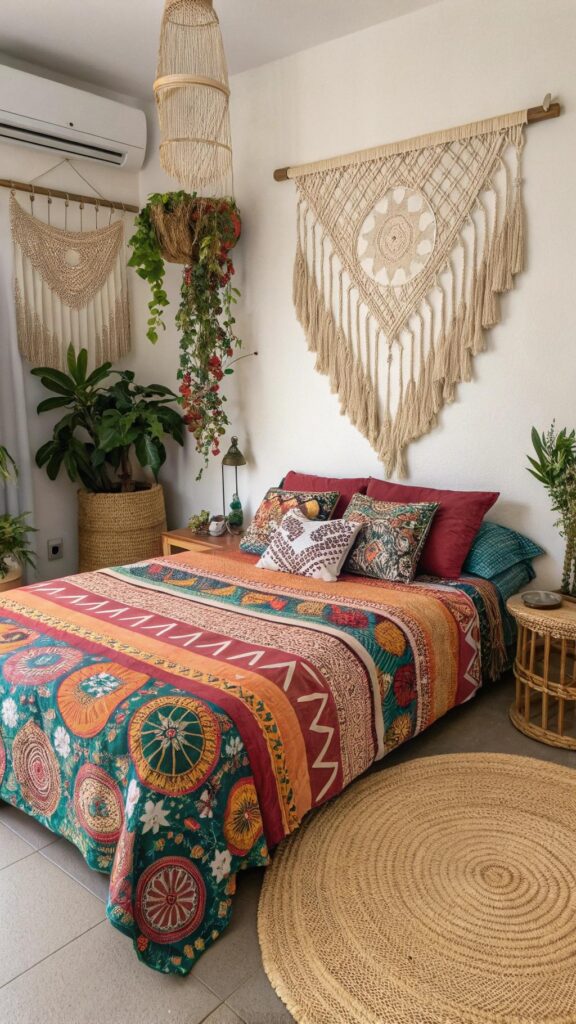 Pair a colorful bedspread with patterned pillows and a woven rug. Add a few macrame wall hangings and plants for a relaxed vibe.