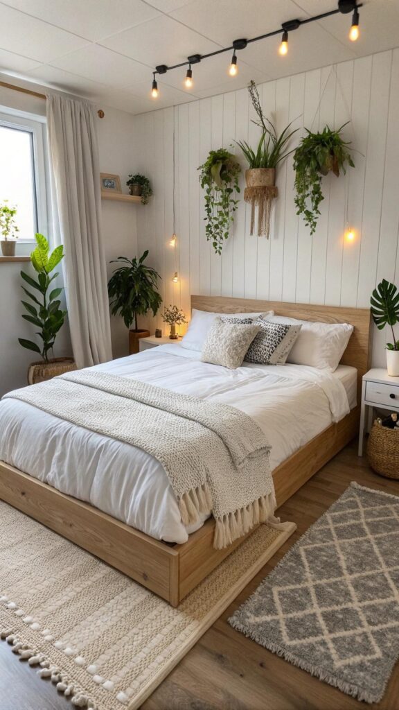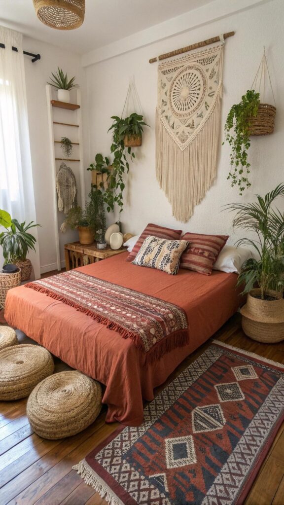 Incorporate plants, macrame wall hangings, and woven baskets for a relaxed vibe. This style is perfect for creating a warm and inviting bedroom. It feels personal and lived-in.