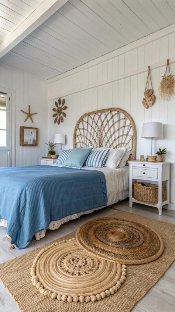 Incorporate natural materials like rattan, jute, and driftwood for an authentic coastal feel. Add nautical decor like seashells or rope accents for a finishing touch.