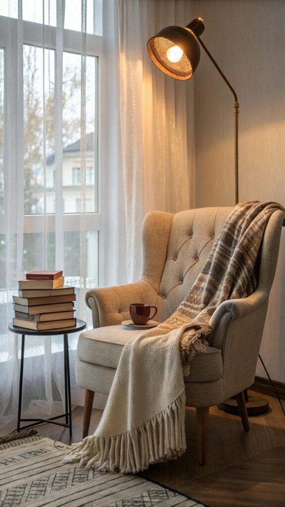 Create a cozy reading nook in your bedroom for a perfect escape. Place a comfortable armchair near a window or in a corner. Add a small side table and a floor lamp for functionality.