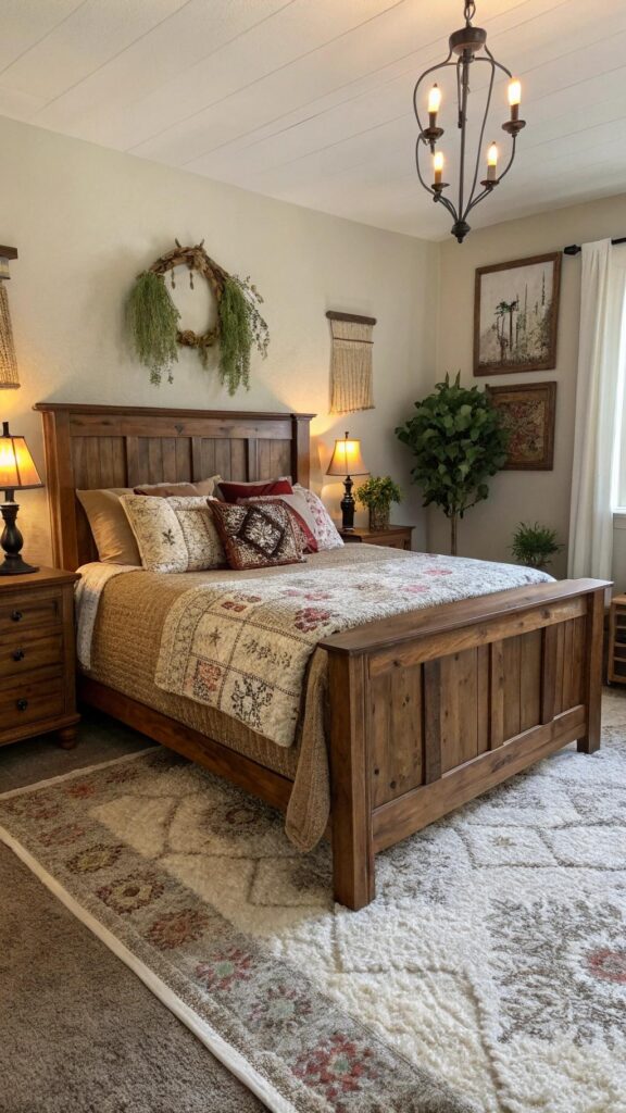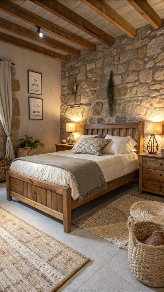 Add a wooden bed frame, a stone accent wall, and soft textiles for a rustic feel. This style is perfect for those who love a cozy, cabin-like atmosphere.