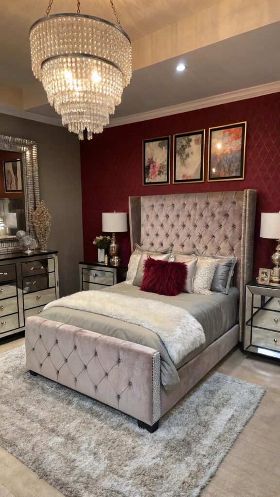 Incorporate luxurious textures like velvet, silk, and faux fur. Add statement pieces like a chandelier or an upholstered headboard.