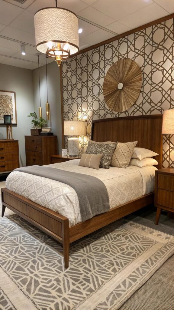 Pair a geometric headboard with velvet bedding and metallic accents. Add a statement chandelier and bold artwork for a dramatic finish.