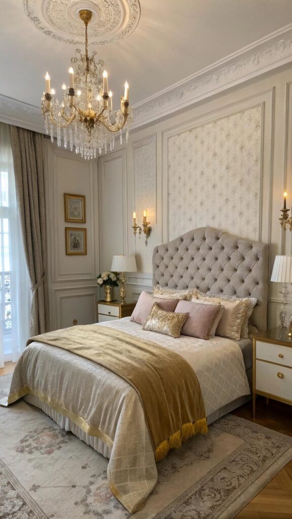 Pair a tufted headboard with silk bedding and gold accents. Add a few vintage decor items and a chandelier for a touch of glamour.