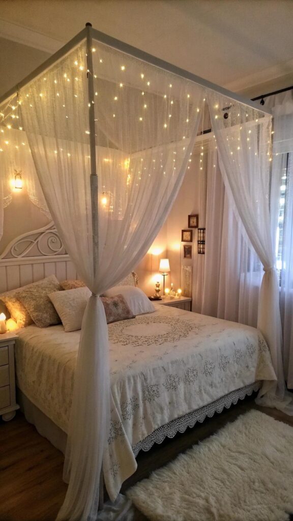 Pair the canopy bed with soft lighting and plush bedding. Add a few candles or fairy lights for extra ambiance. This style is perfect for a grown woman’s retreat.
