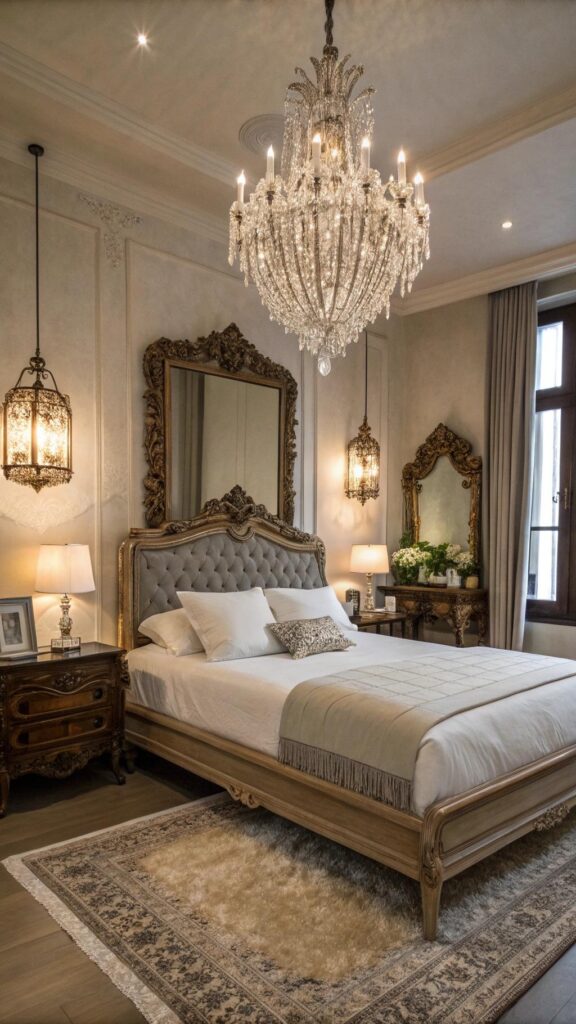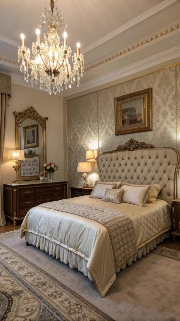 Pair a tufted headboard with silk bedding and antique decor. Add a few statement pieces like a chandelier or a large mirror for a finishing touch.
