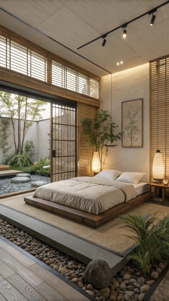 Add a low platform bed, bamboo accents, and soft lighting for a serene atmosphere. This style is perfect for unwinding after a long day.