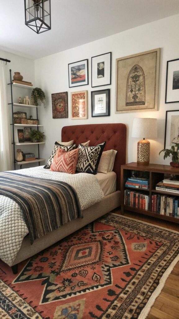 Combine bold patterns with neutral tones to keep the room balanced. Add vintage and modern pieces for a layered and interesting look.