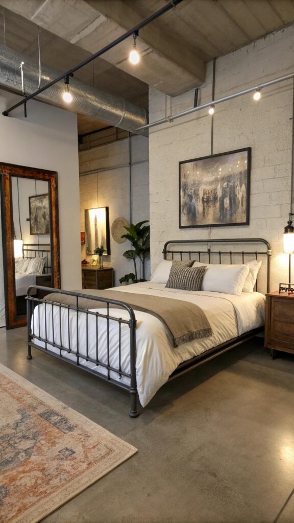 Pair a metal bed frame with crisp bedding and concrete floors. Add a few statement pieces like a large mirror or artwork for a polished finish.