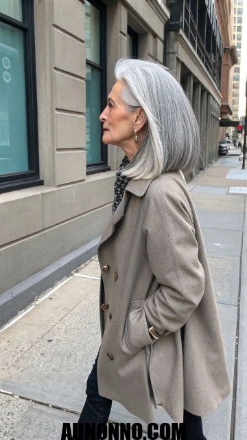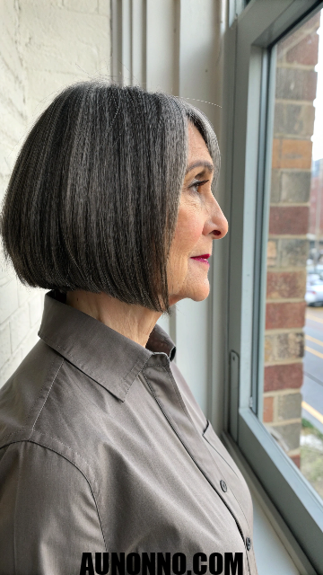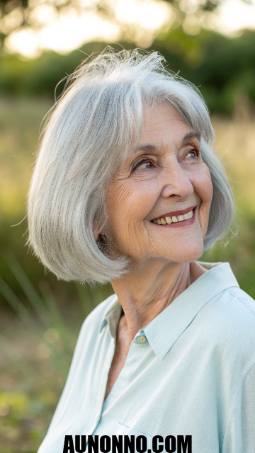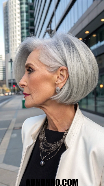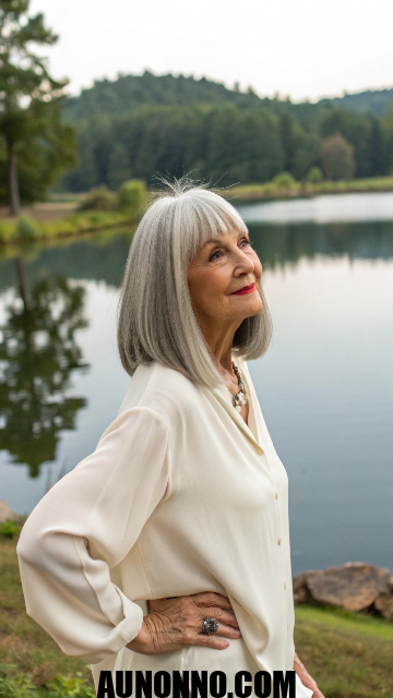 Silver hair shines in this style with subtle layers for movement. You can pair it with bangs to hide forehead lines. The bob works well for straight or wavy textures.