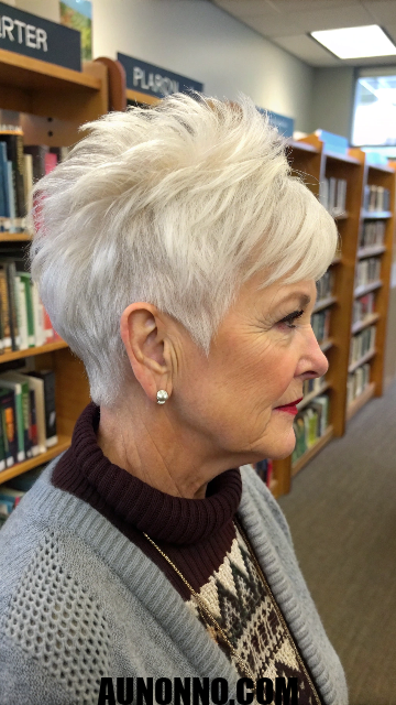This pixie includes long bangs swept to one side for softness. It exposes ears and neckline cleanly. The style boosts thin hair’s appearance.