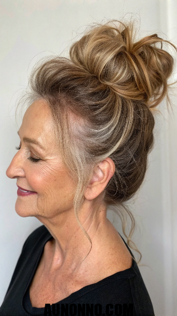 The loose bun piles hair atop the head casually. It allows tendrils to frame the face. This updo offers comfort.