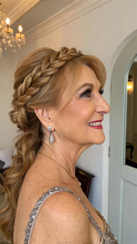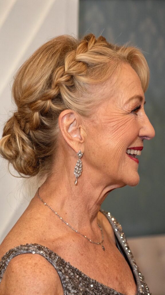 A braided crown is a romantic and sophisticated hairstyle for women over 70. This look features a braid wrapped around the head like a crown, creating a flattering and elegant effect. It’s perfect for special occasions or formal events.