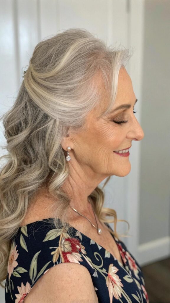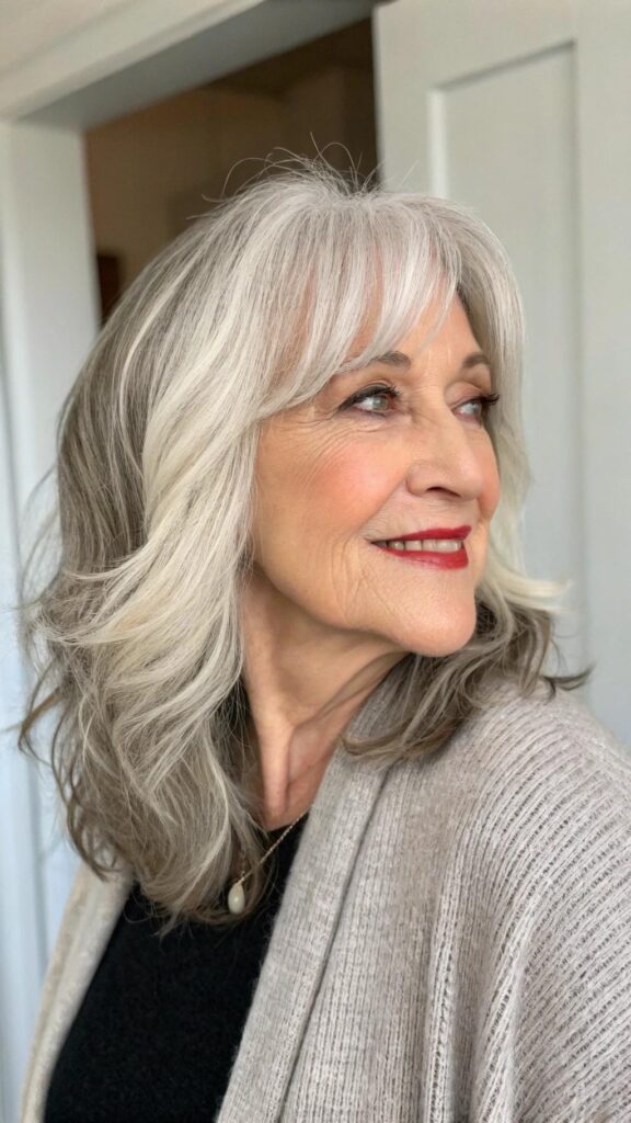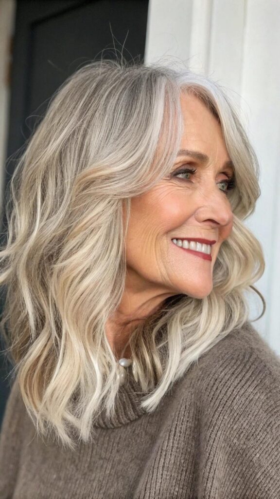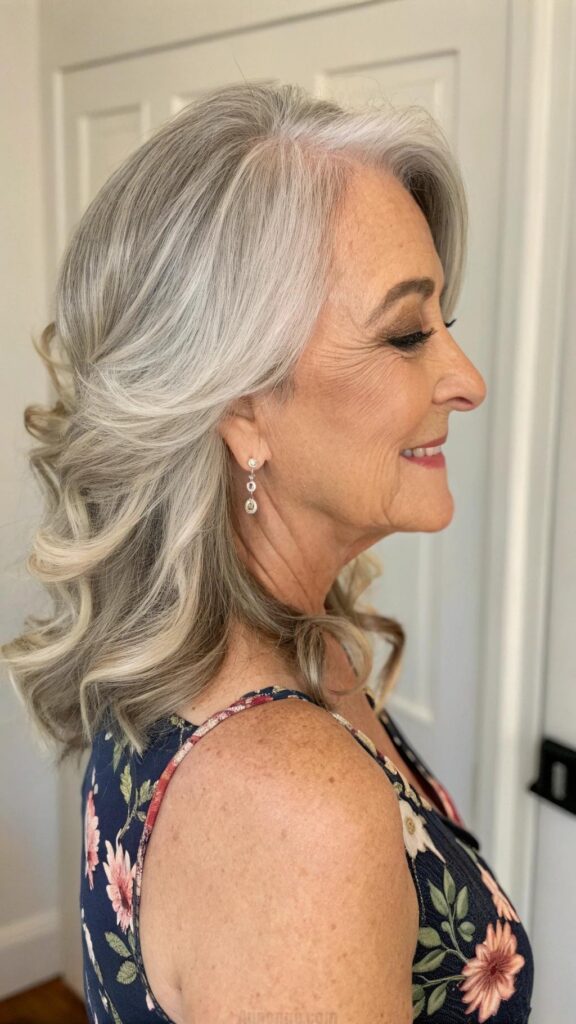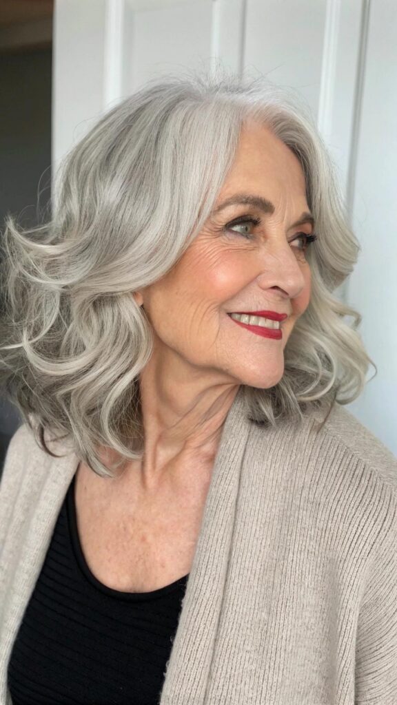 Add some face-framing layers to soften your features and create movement. Shoulder-length waves look stunning with natural gray hair or can be enhanced with subtle highlights. This hairstyle is perfect for both everyday wear and special occasions.
