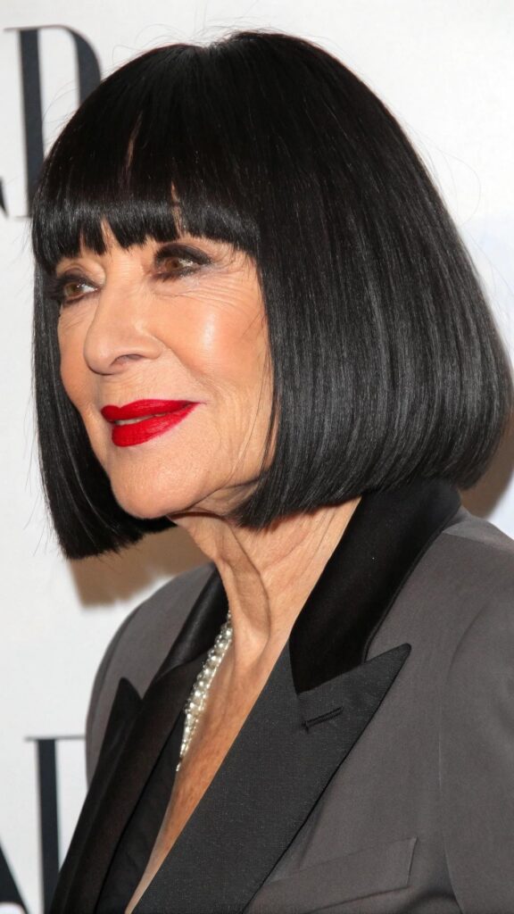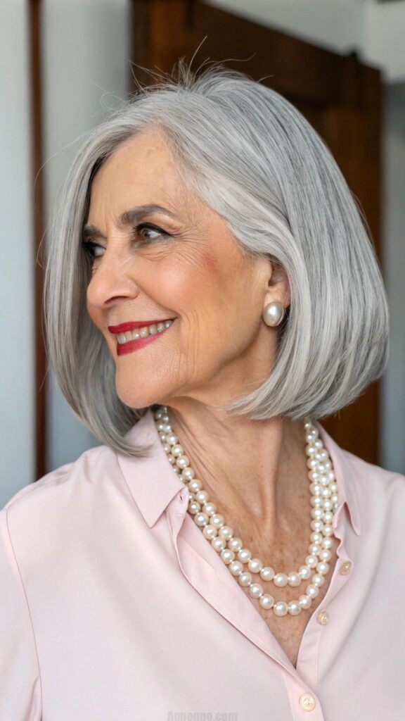 A sleek bob with bangs is a chic and modern hairstyle for women over 70. This look features straight, even ends and full bangs, creating a bold and polished appearance. It’s perfect for those who want a sleek and stylish look.