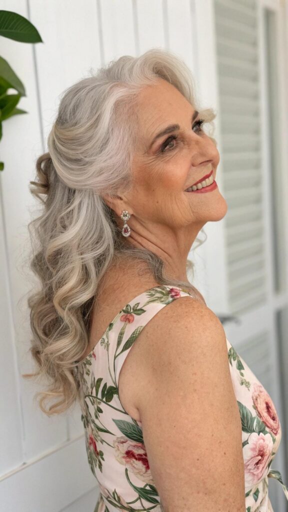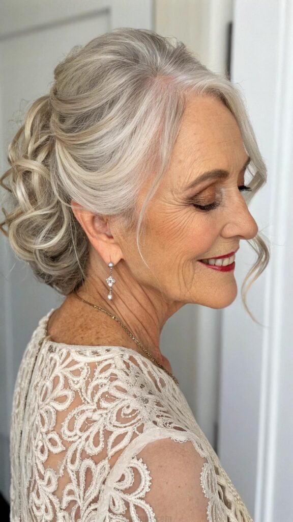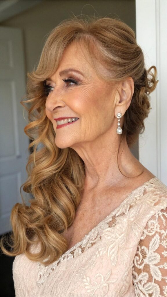 Side-swept curls are a romantic and feminine hairstyle for women over 70. This look features soft, cascading curls swept to one side, creating a flattering and elegant effect. It’s perfect for special occasions or formal events.