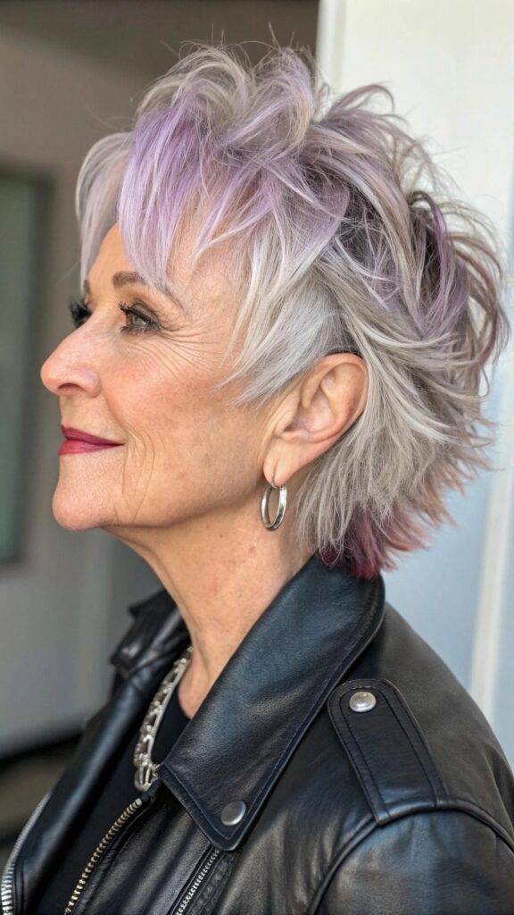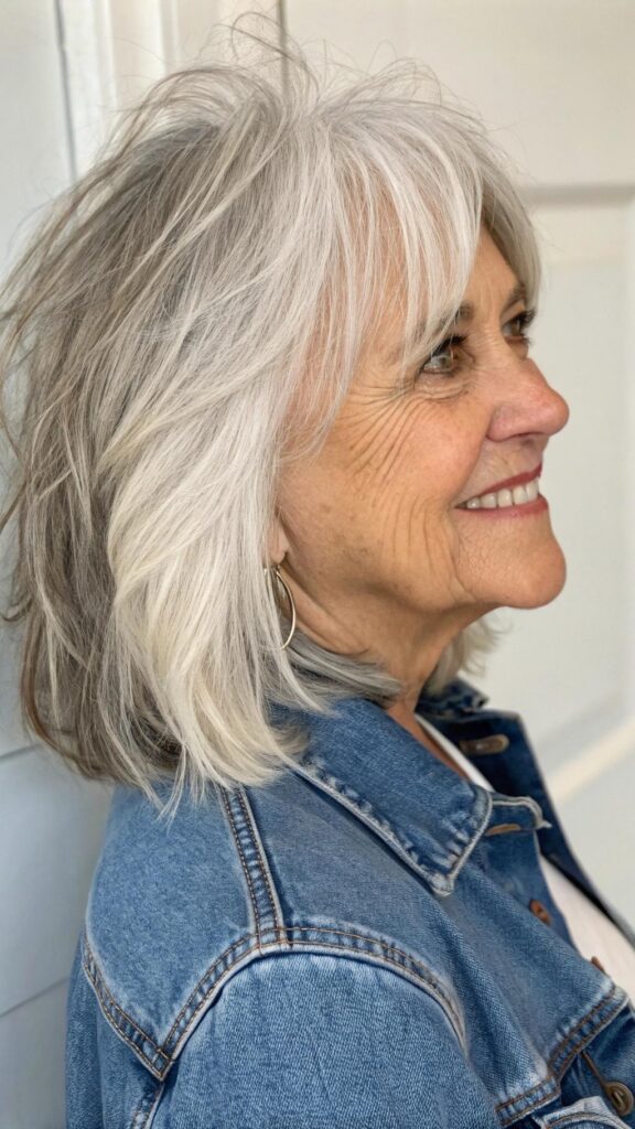 You can style a textured shag with a bit of texturizing spray or mousse for a tousled effect. This hairstyle works well with natural gray hair or can be enhanced with bold colors like platinum or pastel tones.
