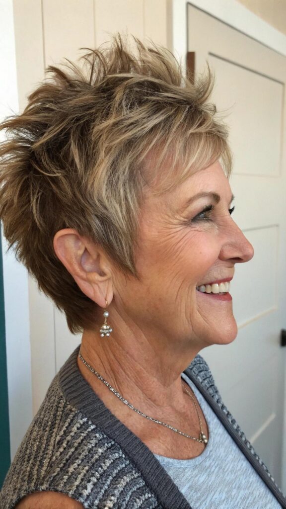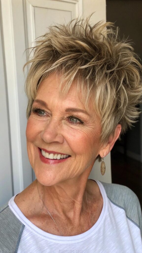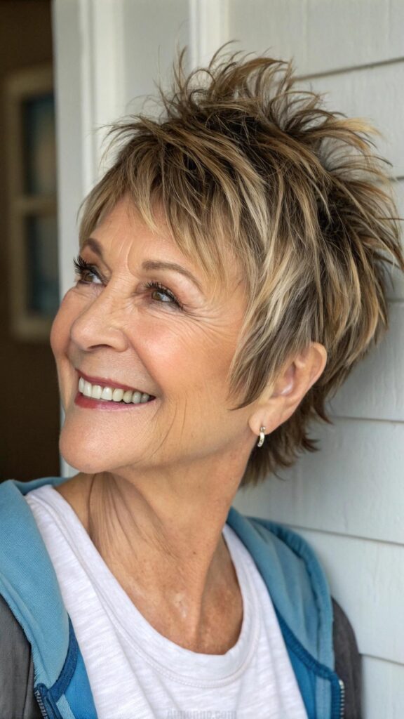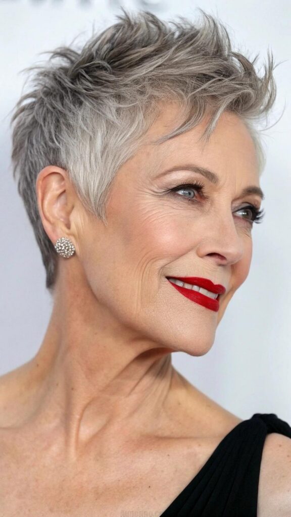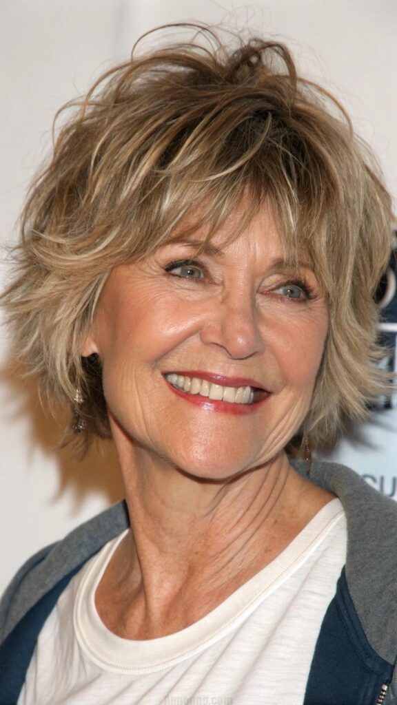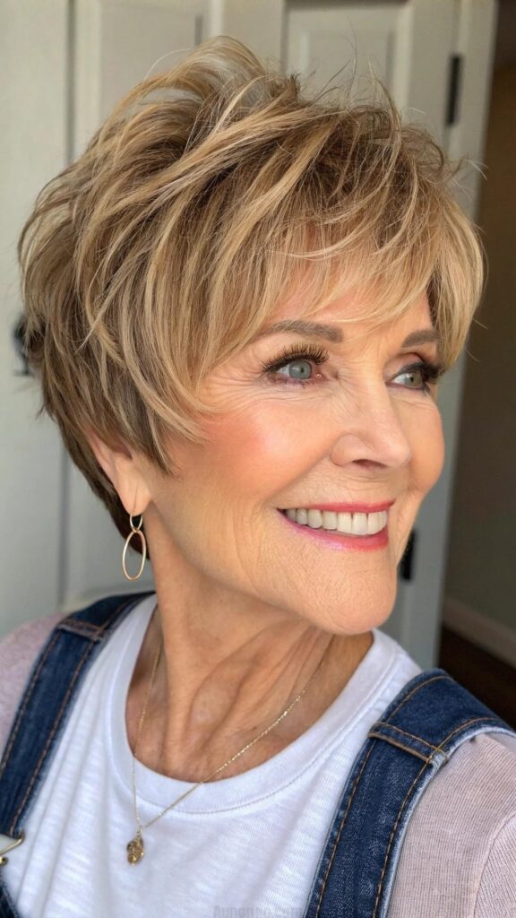 A tousled pixie with choppy layers is a bold and modern choice for women over 60. This haircut features short, choppy layers that add volume and texture. It’s perfect for fine flat hair, as the layers create movement and dimension.